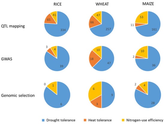 Maize was the earliest main crop where QTL mapping studies were conducted [] (Table 1). Since then, genetic loci associated to traits involved in plant response under environmental constraints such as drought, heat, salinity, and waterlogging, or under nitrogen deficit, have been identified by using either biparental populations or panels of maize lines encompassing wider genotypic variability [,,,,,]. The bibliometric analysis evidences a higher relevance of NUE and related traits in QTL mapping studies conducted in maize compared with rice and wheat (Figure 3).