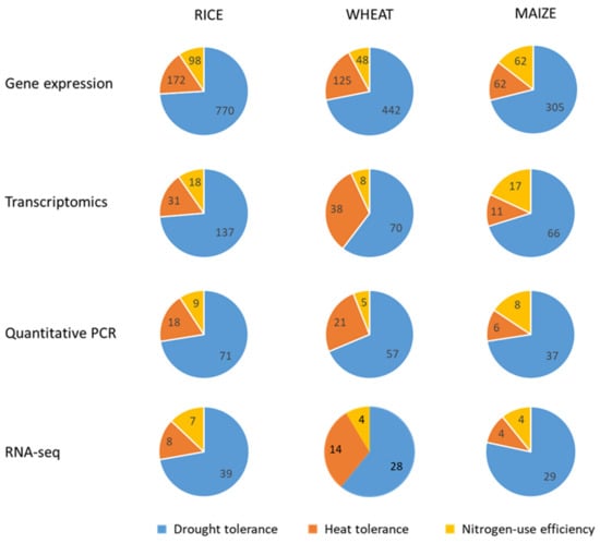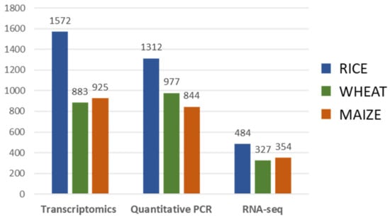 Number of bibliographic records referring to main modern approaches for gene expression analysis in rice, wheat, and maize (source: Web of Science database, all years available; accessed on 15 December 2020).