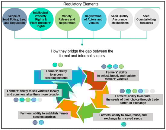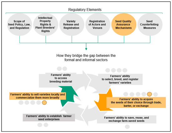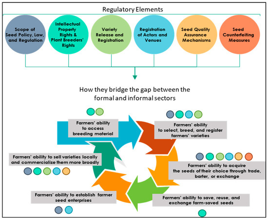 Relationship between regulatory elements and link between informal and formal seed sectors (adapted from [2,9]).