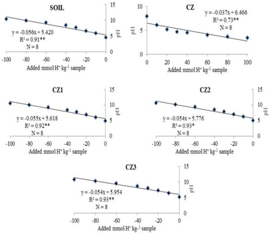 There were three replications in this soil pH buffering capacity study. The titration method was used to determine the soil and CZ pH buffering capacity [] followed by plotting titration curves by increasing mmol H+ kg−1 samples suspended in water. A 1:2.5 sample:water (w:v) ratio was used for soil alone, CZ, CZ1, CZ2, and CZ3. During the titration, 10 g of soil, CZ, CZ1, CZ2, and CZ3 were weighed into 100 mL plastic vials followed by adding 25 mL distilled water. Then, 1 mL 0.05 M CaCl2 was added to the samples to minimize variations in ionic strength followed by adding 0.2 mL toluene to impede microbial activity []. Afterwards, the samples were equilibrated for 15 min at 180 rpm on an orbital shaker for seven days at 25 °C [,,] after which a digital pH meter (SevenEasy pH, Mettler-Toledo GmbH, Switzerland) was used to determine the pH of the samples. For the samples, whose initial pH were less than 5.5, a 0.1 M NaOH was added using Eppendorf pipette to reduce suspension effect []. A 0.1 M HCl was used for the samples whose initial pH were greater six or were slightly acidic to basic. For all of the samples, 1, 2, 3, 4, 6, 8, and 10 mL of 0.1 M HCl or 0.1 M NaOH were used. The suspensions were stirred using a glass rod for 10 s following addition of 0.1 M HCl or 0.1 M NaOH. Thereafter, the pH of the suspensions were determined using a digital pH meter. The amount of mmol H+ needed to change pH by one unit was calculated as the negative reciprocal of the slope of the linear regression based on sample pH (Y-axis) and addition rate of mmol H+ kg−1 sample (X-axis):