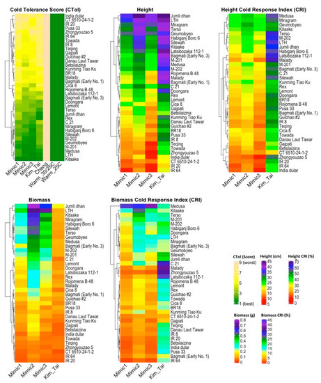 Heatmaps for different low temperature treatment protocols for 36 rice (Oryza sativa) cultivars evaluated for cold tolerance score (CTol), seedling stage plant height, height CRI, biomass, and biomass CRI. CTol = seedling cold tolerance scale (1 = seedlings dark green, 3 = seedlings light green, 5 = seedlings yellow, 7 = seedlings brown, 9 = seedlings dead). CRI = cold response index = (value under stress/value under normal conditions) × 100.