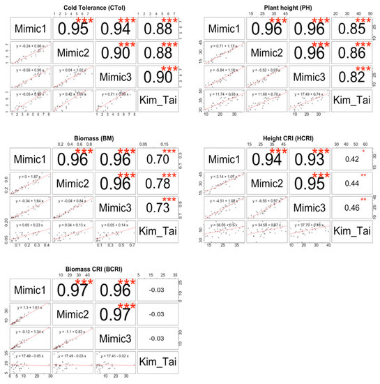 Among the mimic protocols, correlations between cold tolerance scores and plant height, and between cold tolerance scores and biomass were high (0.80–0.91), but between the mimic protocols’ cold tolerance scores and the Kim and Tai protocols’ plant height or biomass, the correlations were only moderate (0.52–0.68) (Figure S7). Similarly, though the correlations between plant height and biomass among all of the four informative cold treatments were high, they were higher among the mimics (0.88–0.96) than between the mimics and Kim and Tai (0.70–0.83) (Figure S7). The correlations were consistent with the greater variation among entries for biomass in the mimic protocols than for the Kim and Tai protocol, as plants in the Kim and Tai protocol were able to accumulate substantial biomass during the warm pretreatment prior to the short duration cold stress.