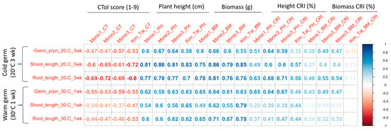 Root and shoot lengths of cultivars after germination at 20 °C for 3 weeks (cold germination) were highly correlated with transplanted seedling plant heights and biomass from Mimic1, Mimic2, Mimic3, and Kim and Tai protocols (Figure 4). Correlations between low temperature germination root or shoot lengths and transplanted seedling cold tolerance scores were mostly moderate for the mimic protocols but high for the Kim and Tai protocol. In contrast to low temperature germination, root and shoot lengths of cultivars after high temperature germination (30 °C for 1 week) were poorly correlated with cold tolerance scores from the mimic protocols. Similarly, correlations were only moderate when comparing root and shoot lengths after high temperature germination with plant height and biomass from the mimic protocols; however, the high temperature germination vs. low temperature seedling correlations were high for biomass from the Kim and Tai protocol.