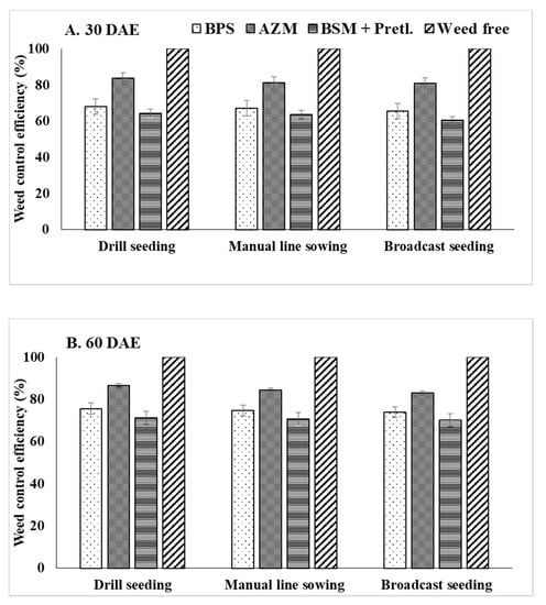 Effect of establishment methods and weed control treatments on weed control efficiency (%) at (A) 30 DAE and (B) 60 DAE at Cuttack, Odisha. Error bars represent standard error of mean. BPS—Bispyribac-sodium (30 g ha−1); AZM—Azimsulfuron (35 g ha−1); BSM + Pretl.—Bensulfuron-methyl + Pretilachlor (70 + 700 g ha−1).