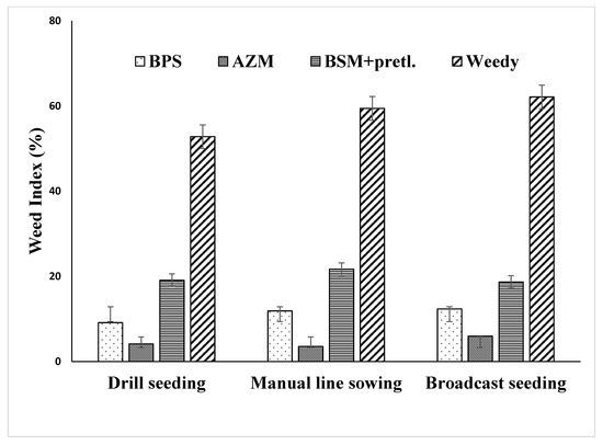 Effect of establishment methods and weed control treatments on weed index (%) at harvest. Error bars represent standard error of mean. BPS—Bispyribac-sodium (30 g ha−1); AZM—Azimsulfuron (35 g ha−1); BSM + Pretl.—Bensulfuron-methyl + Pretilachlor (70 + 700 g ha−1).