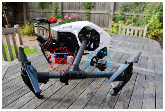 The quadrotor UAV platform in Figure 1 is Inspire 1 of DJI []. The maximum takeoff sea level of this UAV is 2500 m and its maximum speed is 21.9 m/s. The weight of this UAV is 2845 g and its maximum takeoff weight is 3500 g. The maximum flight time is about 1080 s []. The IR sensor, which is marked with a blue circle in Figure 1, is ZENMUSE XT of FLIR [], and the spectral band of this sensor is 7.5 ∼ 13.5 μm []. The multispectral image sensor utilized in this paper is RedEdge-M by MicaSense [], which is surrounded by a red circle in Figure 1. This sensor captures the images of five different wavelengths which are near-IR, red edge, red, green, and blue at the same time. The center wavelength and bandwidth of each image are provided in Table 1.