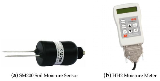 In order to train and validate the soil moisture retrieval model proposed in this paper, the soil moisture level data corresponding to the set of multispectral and infrared images are required as ground truth. The soil moisture sensor system utilized in this paper is constructed by connecting the handheld soil moisture sensor, SM200 from Delta-T [], and the handheld moisture meter, HH2 of Delta-T [], shown in Figure 2.