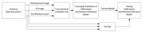 The first step of the CNN-based soil moisture retrieval model development is to collect data from an agricultural field. The multispectral and IR images of the field are acquired with the quadrotor UAV platform in Section 2.1, and the soil moisture level data at multiple points in the field are measured using the soil moisture sensor introduced in Section 2.2. In the next step, the training and validation data sets are constructed from a part of the collected data, and the CNN-based soil moisture retrieval model proposed in this paper is trained and validated with these data sets by utilizing the multispectral and IR images as inputs and the soil moisture level measurements as ground truth. As a result, a trained soil moisture retrieval model is obtained, and it is tested to check the performance in the last step by utilizing the test data set constructed from multispectral and IR images and the soil moisture level measurements, which are not included in the training and validation data sets.