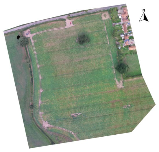 The airborne multispectral and IR images, together with corresponding soil moisture level measurements, are collected at an agricultural field by conducting flights with the UAV system in Figure 1. The data are collected in a single day, 3 September 2018. This field for data collection is located at Claxton, York, United Kingdom. The type of the crop grown in this field at the time of data collection is potato. The picture of the field on the date for data collection is shown in Figure 4.