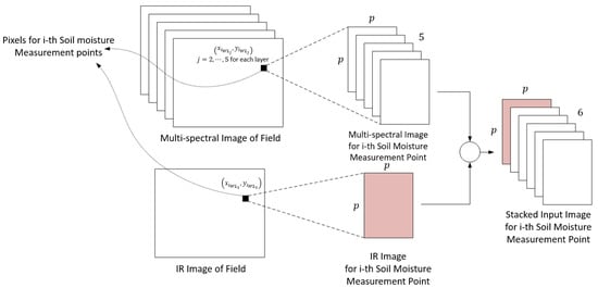 The last step of the input image construction for the soil moisture retrieval model is to stack up the images of all of the six wavelengths for the ith measuremet point. As a result, the pixels of all six of the images corresponding to the same point on the ground are stacked up on the same position. This makes the stacked input image for the ith measurement point to possess the spatial information of each pixel, which can be recognized and utilized by a convolutional neural network. The overall procedures of cropping and stacking up the input images for the ith measurement point are illustrated in Figure 5.