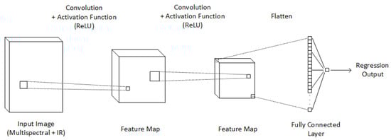 The soil moisture retrieval model proposed in this paper is designed by applying CNN. CNN is utilized in the previous studies for the classification or regression from images with multiple layers of different channels. Since the soil moisture level calculation from input images can be regarded as a regression, the soil moisture retrieval model is constructed to estimate soil moisture level with input images using CNN. The proposed CNN-based soil moisture retrieval model consists of two sequentially connected convolution layers with activation functions and one fully connected layer as addressed in Figure 6.