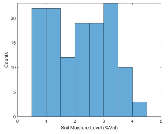 Training, validation, and testing of the proposed CNN-based soil moisture retrieval model is performed in this section to verify and validate the model and analyze the effects of input image construction on the performance of the model. Training is a process to fit the parameters of the CNN-based model, like weights on the filters of convolution layers, using a data set which is composed of input images and the soil moisture level measurements. Validation is conducted to check the performance of the model during training with the data sets that do not include data utilized for training, and its results are considered for tuning the hyperparameters. Testing is a process to check the performance of the trained model using data sets that do not include data utilized for either training or validation. In order to address the effect of input image size, four different cases of p are defined as , 3, 5, and 7. Training, validation, and testing are conducted iteratively for each p with different training, validation, and testing data set for each iteration. Note that all the data for all the six bands gathered by the UAV system are utilized for constructing training, validation, and testing data sets. Each iteration is conducted with different sets of soil moisture level measurement points for training, validation, and testing. The number of iterations is set to be 50 in this paper. In each iteration, all the soil moisture level measurement points are separated into 3 sets randomly to make differences between iterations. The total number of soil moisture level measurement point is 130 in this paper. 110 points among them are randomly selected as training data for each iteration. Another 10 points are classified as a validation set and the remaining 10 points are utilized for testing after training. For the same iteration, the sets of measurement points for training, validation and testing are the same for all the p cases. Only the difference between the p cases is the size of the input image. The distribution of the soil moisture level measurements is shown in Figure 7.