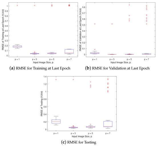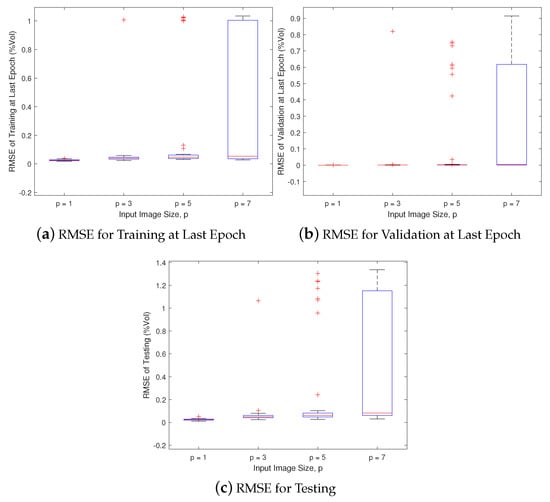 However, Figure 10 indicates that the soil moisture level estimation error is the smallest with . In this training and testing study, the pixel defined as the center of the ith input image is set to be one pixel next to the pixel which actually corresponds to the ith measurement point. As a result, the input images do not include the pixels corresponding to the soil moisture measurement points when . These pixels starts to be contained in the input images as p increases to be more than or equal to 3. Thus, case show significantly smaller estimation error than case. This estimation error becomes larger as p increases since more pixels which do not corresponds to the measurement points are included in the input image.