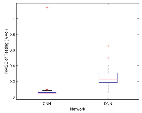 A comparative study is performed between the proposed CNN-based model and a deep-neural-network (DNN)-based model. The proposed CNN-based model utilizes the multispectral and IR images directly as input. On the other hand, since DNN-based model can take a vector as input, the multispectral and IR images are required to be restructured into a vector. When the size of images at each soil moisture measurement point is , the image for each wavelength is restructured into a vector by linking its columns into one vector. The input for the DNN-based model is constructed as a vector by linking all of the vectors obtained from the images of all six wavelengths. The procedures explained above implies not that the pixel values are changed during the above procedures, but that the spatial information of the pixels is abandoned. Thus, the comparative study performed in this paper can show the effect of losing spatial information of pixels in input images on the estimation performance. The DNN-based model for comparison has 2 hidden layers. The first layer consists of 45 neurons and the second layer has 15 neurons. p is set to be 3 for both the proposed CNN-based and the DNN-based models. Training, validation, and testing are conducted iteratively for 50 times with different sets of soil moisture level measurement points for training, validation, and testing in each iteration. Note that the set of soil moisture level measurement points for training, validation, and testing in each iteration is the same for both models. The testing results for both the proposed CNN-based and the DNN-based models are shown in Figure 11.