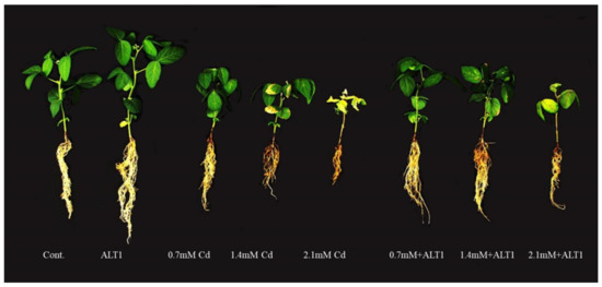 Soybean (Glycine max L.) is one of the most important crop plants worldwide to obtain both seed proteins and oil [22,23]. It has been recorded that Cd stress significantly affected growth parameters of soybean plants [24]. In addition, there are numerous reports on reduced crop growth and development caused by Cd stress in: rice [3,16,25,26], ryegrass [27], switchgrass [28], tomato [21], Eruca sativa [13], and maize [2]. Cadmium-tolerant PGPB can enhance plant growth and development; however only few studies have examined a possible effect of rhizobia on both PGP and Cd-tolerant traits on soybean. Therefore, the objectives of the present study are to explore the role of phytohormone-producing bacterial strain ALT1 of Bacillus cereus on soybean (Glycine max L.) seedlings grown under different Cd stress and to develop biologically safe strategy for its mitigation which would employ phytohormones and secondary metabolites in order to contribute to general knowledge about possible benefits of PGPR on plant growth and development.