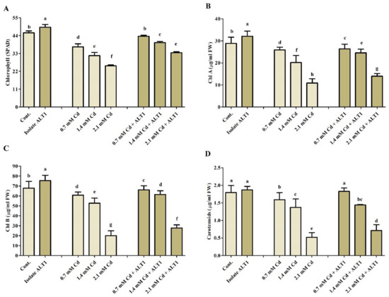 Effect of Cd stress on chlorophyll content of ALT1-inoculated and non-inoculated soybean plants. (A): chlorophyll content (SPAD); (B): chlorophyll a (chl a); (C): chlorophyll b (chl b); (D): carotenoids’ content. Each data point is the mean of three replications and error bars represent standard errors. The bars with different letters are significantly different from each other as evaluated by Duncan’s multiple range test.