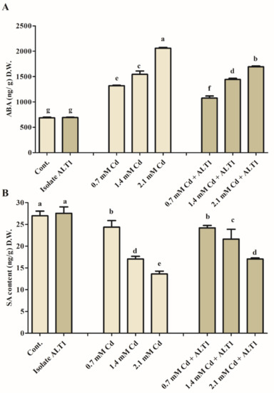 The study results show a significant, 1.57-fold increase in ABA content in soybean plants subjected to Cd stress (Figure 3A). However, a 0.77-fold decrease in ABA content was observed in ALT1-inoculated soybean as compared to Cd-stressed plants (Figure 3A). SA content showed the opposite trend to the endogenous ABA levels increasing 2% under normal conditions and 6–16% in different levels of Cd stress in soybean plants inoculated with Cd-tolerant ALT1 isolate compared to either control or Cd-stressed plants (Figure 3B).