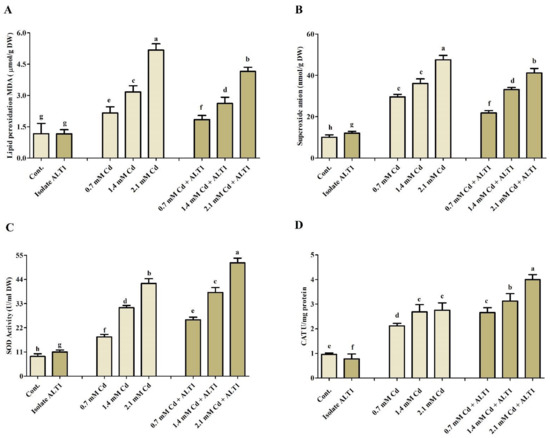 The effect of Cd stress on different antioxidant components of ALT1-inoculated and non-inoculated soybean plants. (A) MDA (lipid peroxidation); (B) SOA (superoxide anions); (C) SOD (superoxide dismutase), and (D) CAT (catalase) contents in soybean plants grown under normal conditions and under Cd stress. Each data point is the mean of three replicates. Error bars represent standard errors. The bars presented with different letters are significantly different from each other as evaluated by Duncan’s multiple range test.