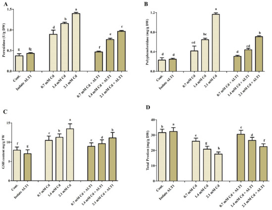 The effect of Cd stress on different antioxidant components of ALT1-inoculated and non-inoculated soybean plants. (A) POD (peroxidase); (B) PPO (polyphenol oxidase); (C) GSH (reduced glutathione); and (D) TP (total protein) contents in soybean plants grown under normal conditions and under Cd stress. Each data point is the mean of three replicates. Error bars represent standard errors. The bars presented with different letters are significantly different from each other as evaluated by Duncan’s multiple range test.