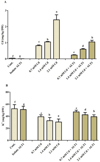 Cd and K content in shoots of soybean plants treated with varying concentrations of Cd (0.7 mM, 1.4 mM, and 2.1 mM) in both ALT1-inoculated and non-inoculated plant was determined following the method reported by Waqas et al. [36] and Jan et al. [32]. In brief, freeze-dried samples were suspended in HNO3 and digested with H2O2. The obtained solution was quantified using inductively coupled plasma mass spectrometer (ICP-MS; Optime 7900DV, Perkin-Elmer, Waltham, MA, USA).