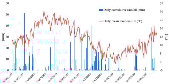 Daily rainfall (columns) and air temperature (line) during the field experiment (April 2019–April 2020).