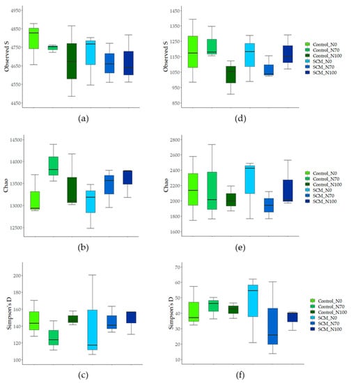 Estimation of α-diversity indexes and richness of each field separately for bacteria (a–c) and fungi (d–f). Control_N0 = Control with 0% N-fertilization; Control_N70 = Control with 70% N-fertilization; Control_N100 = Control with 100% N-fertilization; SCM_N0 = SCM with 0% N-fertilization; SCM_N70 = SCM with 70% N-fertilization; SCM_ N100 = SCM with 100% N-fertilization.