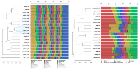 Taxonomic comparison of all samples (a, bacteria; b, fungi) through hierarchical clustering of microbial communities at the order level across all samples used in this study. Clusters were identified with the average linkage algorithm for taxa that contributed at least 5% to a single sample. Taxa that contributed less than this threshold were added to the sequence group denoted “other”. Control_N0 = Control with 0% N-fertilization; Control_N70 = Control with 70% N-fertilization; Control_N100 = Control with 100% N-fertilization; SCM_N0 = SCM with 0% N-fertilization; SCM_N70 = SCM with 70% N-fertilization; SCM_ N100 = SCM with 100% N-fertilization.