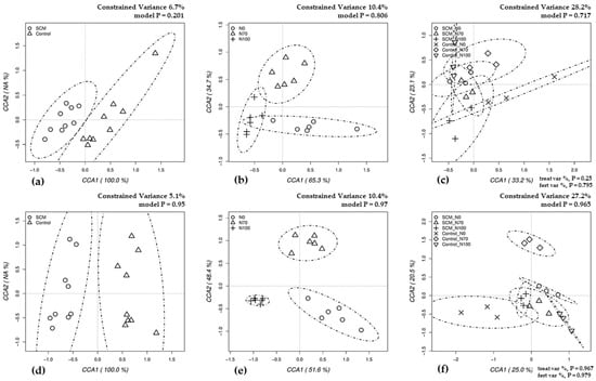 Canonical correspondence analyses (CCAs) on the impact of the treatments on the structure of bacterial (a–c) and fungal (d–f) communities. Determined by the relative abundances of all the operational taxonomic units OTUs obtained by Illumina sequencing of bacterial 16S and fungal ITS amplicons. Control_N0 = Control with 0% N-fertilization; Control_N70 = Control with 70% N-fertilization; Control_N100 = Control with 100% N-fertilization; SCM_N0 = SCM with 0% N-fertilization; SCM_N70 = SCM with 70% N-fertilization; SCM_ N100 = SCM with 100% N-fertilization.