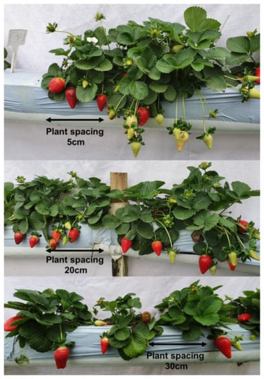 - Tariq, R.; Qureshi, K.M.; Hassan, I.; Rasheed, M.; Qureshi, U.S. Effect of planting density and growing media on growth and yield of strawberry. Pak. J. Agric. Res. 2013, 26, 113–123. [Google Scholar]