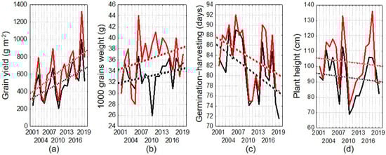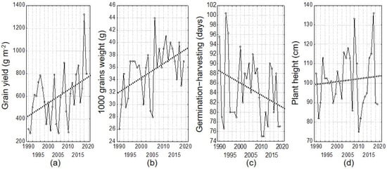 The effect of climate change on the crop is most obvious in the data of a single cultivar accumulated for many years. Compared with the data of the state variety trials and large-scale crop plantings, the impact of cultivar replacement procedures is smoothed in these long-term observations. The reference cultivar ‘Gorizont’ demonstrated from 1990 through 2019 statistically significant increases in the grain weight per 1 m2 (by 114.7 g/10 years, p = 0.015) and 1000 grain weight (by 2.3 g/10 years, p = 0.007) (Figure 1). The length of the period from germination to harvesting shortened slightly by 2.5 days/10 years (p = 0.092). Plant height values did not change significantly. Lodging resistance scored 7–8 points in 1990–1998, and 9 points beginning from 1999; resistance to Helminthosporium leaf blotch was assessed at 6–8 points in 1990–2000, 9 points in 2001–2011, and 7–9 points from 2012 through 2019. Grain yield significantly correlated with 1000 grain weight (r = 0.48), while its association with plant height was not statistically significant (r = 0.11).