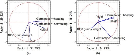 The PCA of five characters showed that the main factor that differentiated the studied accessions encompassed plant height and length of the germination to heading period: correlations of these characters with the first factor were at r = 0.78 (Figure 3). The second factor was associated with grain yield (r = −0.87) and 1000 grain weight (r = −0.77). The third factor was closely linked (r = −0.75) to the duration of the growing season. Three first factors explain 80.2% of variance, and may be regarded as sufficient according to the scree test.