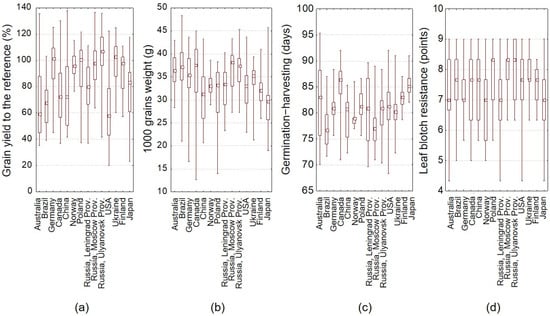 Large groups of cultivars from 14 countries were searched for promising sources of new combinations of useful agronomic traits. Grain yield was expressed as the percentage of the reference value. The ANOVA showed that the groups from different countries significantly differed in all studied indicators at the level of p < 0.005; useful agronomic traits of the groups are presented in Figure 4. The Kruskal–Wallis test revealed statistically significant differences in the resistances to lodging (p = 0.018) and leaf blotch (p < 0.001).