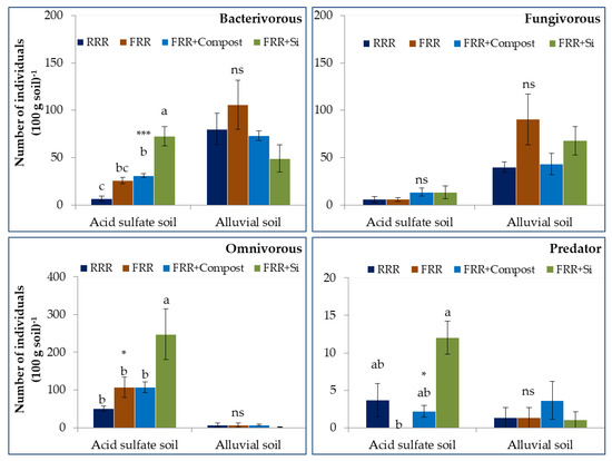 The abundance (mean ± standard error, n = 4) of the trophic structure of the free–living nematode community among treatments in the acid sulfate soil in Ben Tre province and the alluvial soil in Kien Giang province, Vietnam. The different letters indicate a significant difference among treatments at * p < 0.05; *** p < 0.001; ns, not significant. RRR, triple–rice system; FRR, fallow and double–rice; FRR + Compost, fallow and double–rice with 3 Mg ha–1 sugarcane filter cake compost; FRR + Si, fallow and double–rice with 100 kg ha–1 silicate fertilizer.