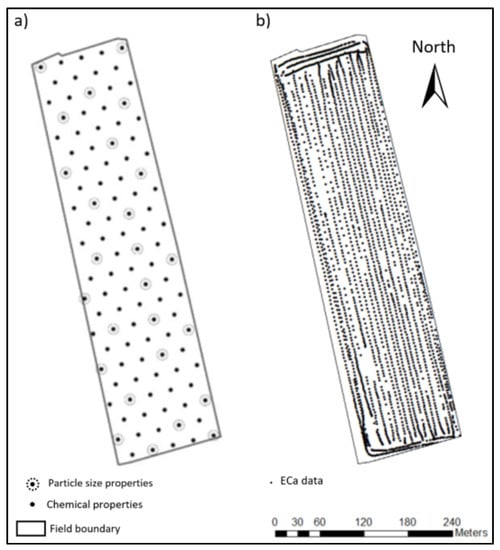 On 5 October 2016, apparent soil electrical conductivity (ECa) data were acquired using a commercial Veris-3100 galvanic contact resistivity sensor (Veris Technologies, Inc., Salina, KS, USA) equipped with a Garmin GPS 17x HVS sensor (Garmin International, Olathe, KS, USA) with an accuracy of less than 1 m. This sensor was configured according to the Wenner array using six coulter-electrodes (one pair to inject current and two pairs to measure change in electrical potential), as described by Sudduth et al. [43] This resulted in two depths of investigation: approximately 0.0–0.3 m (ECa30) and 0.0–1.0 m (ECa100). The data from the sensor were acquired on parallel transects spaced approximately 7 m apart using a 1 Hz logging frequency, which corresponds to a measurement every 2–3 m when operating at a speed of approximately 10 km/h, giving a density of at least 245 samples/ha (Figure 1b). Erroneous ECa data were eliminated by the exclusion of points exceeding three standard deviations [44].