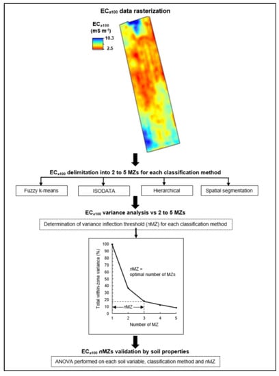 Specific input management based on MZs is a common way of managing within-field variability in agricultural production. The ECa-based zones were expected to be relatively homogeneous in terms of water holding capacity, which might be linked to some soil properties and tuber yield. There are various methods to delineate MZs, including fuzzy k-means, ISODATA, hierarchical, and spatial segmentation. Figure 2 presents the modus operandi for the evaluation of the delineation methods using ECa100 data to delineate management zones (MZs) based on soil properties.