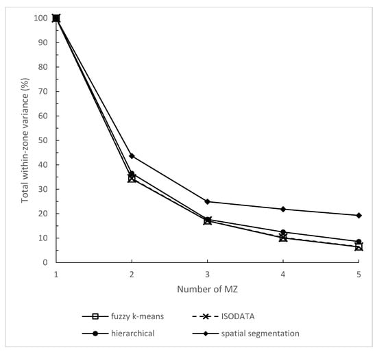When the number of MZs was increased from one to five, the total within-zone variance of the ECa100 measurements decreased from 100% to 6%, 7%, 9% and 19%, according to the fuzzy k-means, ISODATA, hierarchical and spatial segmentation delineation methods, respectively (Figure 3). Other studies also showed a large reduction in the total within-zone variance of soil ECa when the number of MZs was increased from one to five [16].