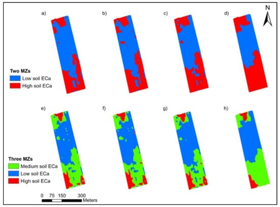 The delineations into two and three MZs, using the three classification methods without spatial constraints (i.e., fuzzy k-means, ISODATA and hierarchical), produced a similar partitioning of MZs (Figure 4a–c,e–g). However, the spatial segmentation method (Figure 4d,h) resulted in more compact MZs compared to the other classification methods due to the spatial segmentation inherent algorithm bias.