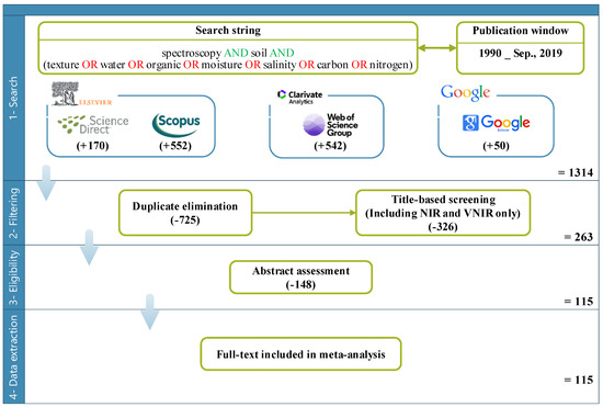 Although this systematic review could suggest an unbiased collation of available literature on V-NIR soil spectroscopy, it has some inherent methodological limitations. The scientific search engines used in this review have picked mostly peer-reviewed articles. The unintentional exclusion of unpublished and gray literature might have created publication bias since studies with significant “positive” results are more likely to be published than those with negative outcomes.