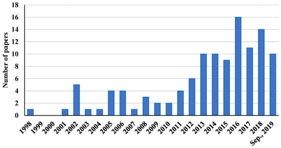 The number of V-NIR spectroscopy articles for soil property prediction has noticeably increased in the last decade (Figure 2). The research was conducted in 30 different countries, predominantly from China (32) and the USA (16), followed by Italy (8), Germany (6), and Brazil (6) (Figure S3 in the supplementary data). As can be seen in Figure 2, in the last four years, more research has employed V-NIR technology for soil spectroscopy than at any time before. This can be due to the need to identify soil characteristics in a fast and cost-effective manner, and also, it implies that soil V-NIR spectroscopy is gaining more attention and trust in the research community.