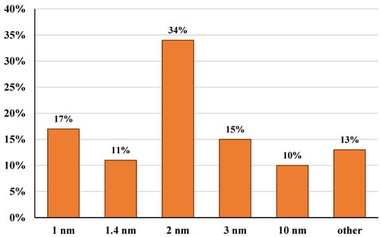 V-NIR spectroscopy application in soil studies is not restricted to a specific type or brand of instruments (Figure S2 in the supplementary data). However, ASD FieldSpec (field-portable spectroradiometer) and FOSS NIR System (laboratory-based instrument) appear to be the most popular instruments for this type of application, with ASD FieldSpec used in 39% of the reported outcomes compared to 21% for FOSS NIR System (Figure S2 in the supplementary data). It is worthwhile to mention that some of the included articles have designed their own instruments [33,34]. Out of the 115 selected articles, only 25 articles have used NIR spectroscopy (700–2500 nm of wavelength) alone, while the rest used both visible and NIR (400–2500 nm of wavelength). In terms of spectral resolution, analysis at the 2 nm interval was the most commonly used with 34% of the total reported outcomes (Figure 3). This is mainly due to the features of the employed instruments.
