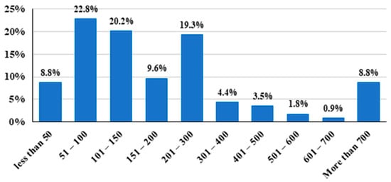 Soil spectroscopy conducted in the laboratory on dried and sieved samples was reported in 85% of the total reviewed articles. In situ measurement on the soil surface instead represents 11% of the selected articles, while the remaining 4% have used soil spectroscopy on-the-go mounted on mobile platforms. There are some international protocols for sample preparation for reflectance measurements in the laboratory that some of the reviewed studies employed [35,36,37], but there are less pre-defined standards for in situ and on-the-go measurements. Most of the studies (almost 74% of the reports) took their soil samples from less than 10 sites and very few (7%) relied on existing samples from soil banks. The number of soil samples analyzed varied from less than 50 to more than 700, with samples between 50 and 150 being the most common (Figure 4). The number of samples mostly relies on the variety and heterogeneity of the soil, the soil characteristics under study, the experimental design, and the application. Out of the 115 articles, 109 dried their soil samples before analysis, of which 67% were air-dried, and the remaining 33% used oven-drying methods. The oven-drying process duration was mostly (56%) up to 24 h (Table S5 in the supplementary data). In total, 98 articles reported grinding soil samples before analysis, and 79 of them used a 2 mm sieve size. Although the drying and grinding procedures have happened for samples before spectroscopy analysis, they have usually coincided with reference analytical requirements (e.g., wet chemistry methods), and sometimes, they have been influenced by them.
