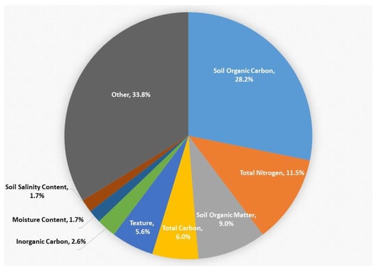 Most of the 115 articles included for the meta-analysis reported more than one soil property. Although we have restricted our search to only six main properties, in the reviewed articles, there were up to 81 soil properties reported to be predicted by V-NIR spectroscopy (Table S6 in the supplementary data). Among the six properties that this research focused on, SOC (28.2%) and TN (11.5%) have the highest number of reports (Figure 5). These are the same properties that are very significant to measure and know for agricultural activities.