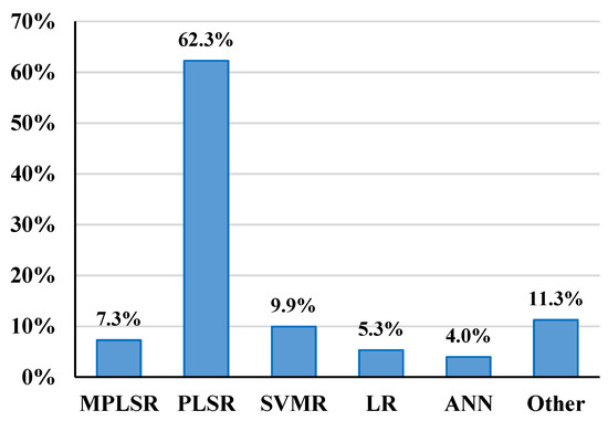 Machine learning and statistical methods employed as the regression tool in the reviewed studies (MPLSR: Modified Partial Least Square Regression, PLSR: Partial Least Square Regression, SVMR: Support Vector Machine Regression, LR: Linear Regression, ANN: Artificial Neural Network).