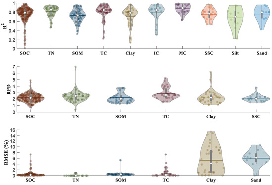The goodness of prediction for all 10 soil properties is illustrated in Figure 9. According to [45], when RPD is greater than 3 and R2 is greater than 0.9, the prediction is “excellent”. Whereas RPD values from 2.5 to 3.0 and R2 values from 0.82 to 0.9 denote “good” predictions. “Approximate quantitative predictions” are indicated by RPD values between 2.0 and 2.5 and R2 values in the range from 0.66 to 0.81. The possibility “to distinguish between high and low values” is revealed with RPD values between 1.5 and 2, and R2 values between 0.5 and 0.65. “Unsuccessful” predictions have RPD values lower than 1.5 or R2 values lower than 0.5.