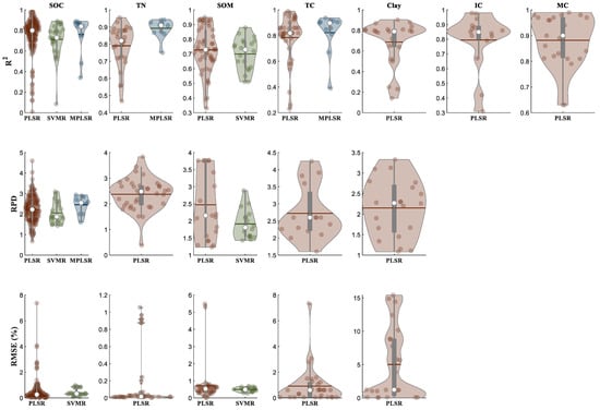 The coefficient of determination (R2), the Ratio of Performance to Deviation (RPD), and the Root Mean Square Error (RMSE) are the most common statistical features reported in the selected articles to evaluate the performance of soil property prediction through V-NIR spectroscopy. Therefore, these measures are chosen in this study to report the accuracy of prediction across soil properties (Figure 7) and regression models (Figure 8). While higher R2 and RPD values represent better predictions, lower values of RMSE indicate higher accuracy, as RMSE is a measure of error.