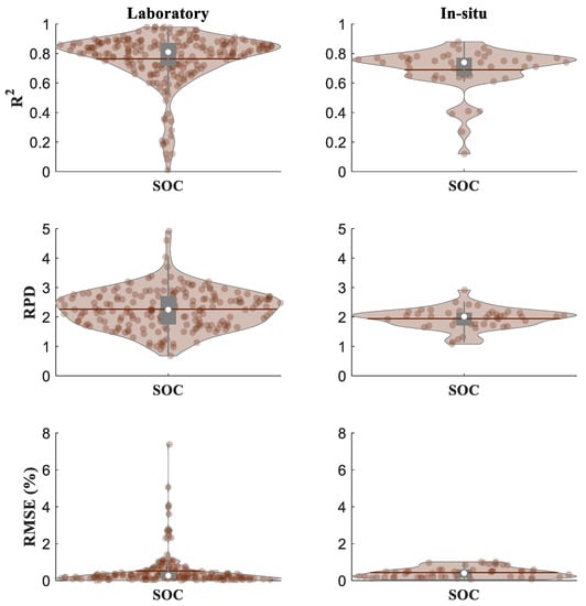 Figure 10 compares the results for Soil Organic Carbon (SOC) predicted in the laboratory with in situ (in the field) conditions. It is worthwhile to mention that because some of the reviewed articles mentioned SOC as the target of their analysis, and others mentioned SOM, we followed the same terminology and discriminated the results. SOC was the only property having enough data to compare the results of laboratory versus in-field analysis. As expected, the results from laboratory analysis are slightly better than those from in situ conditions. Although the difference in performance between the two methods of using V-NIR spectroscopy, as reported by the selected articles, is not sharp, the pool from which those numbers are obtained differs largely with many more records available for lab-based analysis. This can be the main reason for more uncertainty in the results of lab-based studies, indicated by higher spans and wider distributions of the data points in Figure 10.