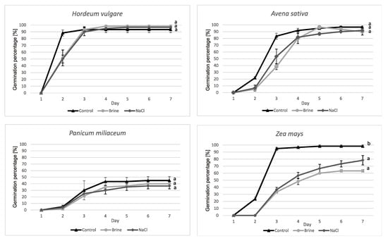 Similar results at a salinity of 150 mM NaCl were reported by Piernik et al. [17] for fodder beet (Beta vulgaris L.) and by Szymańska et al. [59] for rape (Brassica napus L.). Its higher optimum temperature of germination may cause the small success of germination for P. miliaceum independent of growth medium compared to the other species. According to Kamkar et al. [56], the GP of millet is affected by increased temperature. The highest germination occurred at 35 °C [56]. We observed limitation of germination under salinity treatment only in Z. mays, but we did not find a significant difference between brine and NaCl variants. In this case, the negative influence of salinity stress compared to the control may be associated with water intake [60]. A high concentration of NaCl and other salts in the solution increases osmotic potential, and water is not absorbed from the solution, which may delay and decrease germination rate [61]. High absorption of Na+ and Cl− ions by seeds can also be toxic, and inhibits the rate of germination, thereby decreasing germination percentage [62].