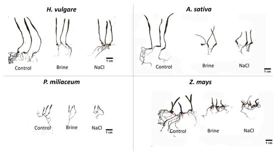 Regarding all model plants, we did not find differences between brine and NaCl treatments. Hence, ionic composition did not significantly affect seedling development. This is the opposite of findings reported by Panuccio et al. [66] that the seedlings of quinoa were differently affected by treatments in respect to salt type and concentration. However, in our case the predominant ions in both solutions were Na+ and Cl− (Table S1). Therefore, ionic composition would not affect growth in such a short period of seedling development.