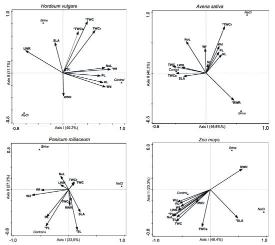 We obtained different results after six weeks of plantlet growth. First, we noticed very low growth success of tested species, especially in P. miliaceum and Z. mays. According to, for example, Konuşkan et al. [14] and Cuartero et al. [15], germination and early seedling growth is more sensitive to salinity than are later stages of growth. Our results were opposite to these findings. This is evidenced by the small number of plants surviving in brine and NaCl treatments. However, the observed reduction in survived individuals’ growth rate under salinity is in line with previous research e.g., [67]. The negative action of salinity can be distinguished at several levels, such as shoot, root and tissues [7]. The number of leaves (NoL), the length of root (RL) and the total plant length of H. vulgare, P. miliaceum and Z. mays were lower in brine and NaCl solution compared to control. These results are consistent also with those obtained by Tsegay and Gebresslasie [68], who observed a significant reduction in the number of leaves and the length of roots under salinity stress between seven cultivars of two tested crops, and with the findings of Alam et al. [69], Anuradha [70], Mu et al. [71] and Munns [34]. Decreases in root and shoot lengths of cultivar plants under salt stress may be due to limited metabolites delivery to young growing tissues, because metabolic production is significantly perturbed at high salt stress either by low water uptake or ionic toxicity [72]. We also noticed a reduction in total fresh weight (Wf) and total dry weight (Wd) for H. vulgare and Z. mays under salt treatments. These results are in agreement with those obtained by Sozharajan and Natarajan [62]. They reported that biomass accumulation was significantly higher in a control crop than in NaCl conditions [62]. This also corresponds with the conclusion of Gururaja Rao et al. [73], who stated that salinity reduced biomass production [74]. However, total biomass can be affected by ion accumulation in tissues [75] and can, therefore, be even higher under salinity, as observed for A. sativa and P. miliaceum. After six weeks, the lowest effect of salinity on plantlet growth was noticed for A. sativa. No effect of NaCl stress on the survival rate of oat seedlings was reported by Mu et al. [71]. This result can be explained by the fact that oat can accumulate much higher sodium ion levels than wheat and other seasonal crops [75]. However, Halima et al. [74] proved a progressive decrease in root and shoot lengths in A. sativa with increasing NaCl level. These different results of plantlet development may also depend on the species cultivar under consideration [16,65]. Discriminant analysis, taking all investigated traits into consideration, revealed that the most affected traits of C3 plants H. vulgare and A. sativa were related to water management. These results agree with the general assumption that C3 photosynthesis is negatively affected by salinity stress measured as changes in leaf water potential or relative water content [76]. H. vulgare had a problem with water absorption under the NaCl treatment, which was expressed by lower tissue water content in shoots. A. sativa had a different strategy, by accumulating water in roots under this treatment. In the case of the C4 plants P. miliaceum and Z. mays, water absorption was not affected, but the most affected traits included morphological parameters such as plant length. C4 plants are characterized by resistance to water deficit [77]. One of the main reactions to salt or drought stress is the closing of stomata, which reduces transpiration, allowing water to be saved [76]. Thanks to higher stomatal resistance in C4 plants, a low transpiration rate occurs. It is well known that C4 plants use water more efficiently than C3 plants [78].