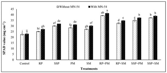 Effect of phosphorus fertilizers, organic manures, and Bacillus sp. MN-54 addition on chlorophyll content (SPAD value) of chickpea measured at 55 d after sowing. Column and error bars represent means and standard errors of triplicate values, respectively. Means having different letters differ significantly according to LSD test at p ≤ 0.05. (MN-54, Bacillus sp. MN-54; RP, rock phosphate; SSP, single super phosphate; PM, processed manure; SM, simple manure).